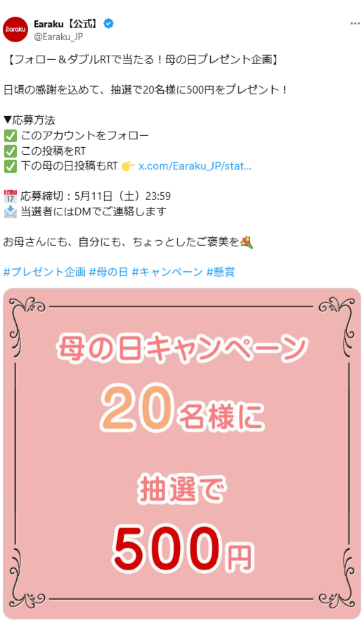 ✅ 下の母の日投稿もRT 👉 https://x.com/Earaku_JP/status/1914263432846528543