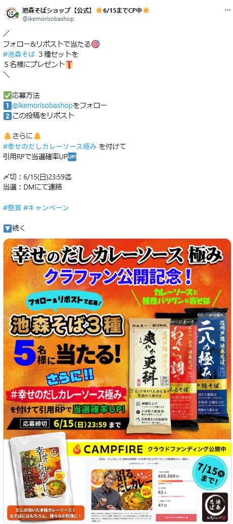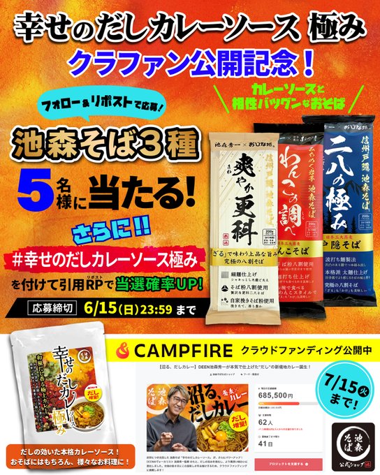 【幸せのだしカレーソース極み】クラウドファンディング公開記念!池森そば3種を5名様にプレゼント