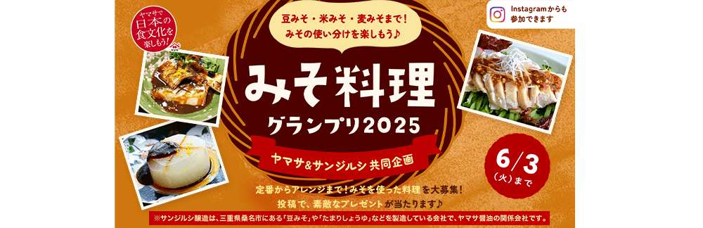Instagram上で、「@yamasa_soy_sauce」をフォローして ハッシュタグ #ヤマサ #サンジルシ を付けて投稿してください。