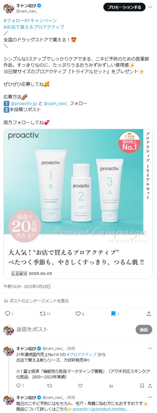 1⃣ @proactiv_jp と @cam_navi_ フォロー