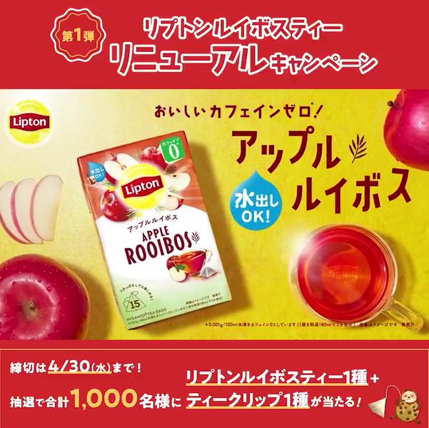 抽選で合計1,000名様にリプトンルイボスティー1種+ティークリップ1種当たる