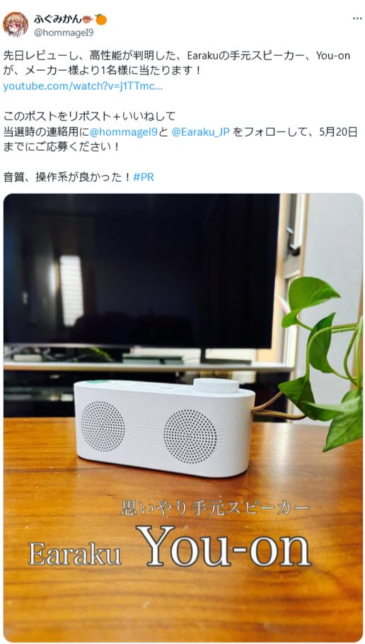 - 先日レビューし、高性能が判明した、Earakuの手元スピーカー、You-onが、メーカー様より1名様に当たります!