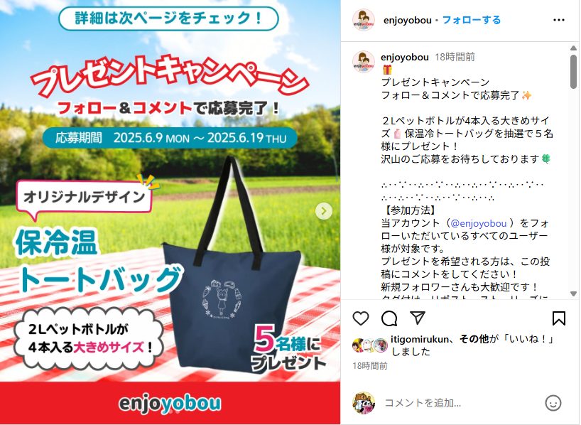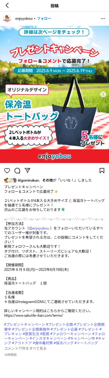 - 大容量の保温冷トートバッグが当たる!Instagramキャンペーン