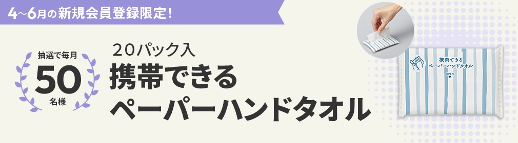- 携帯できるペーパーハンドタオル20パック入が抽選で毎月50名様に当たる