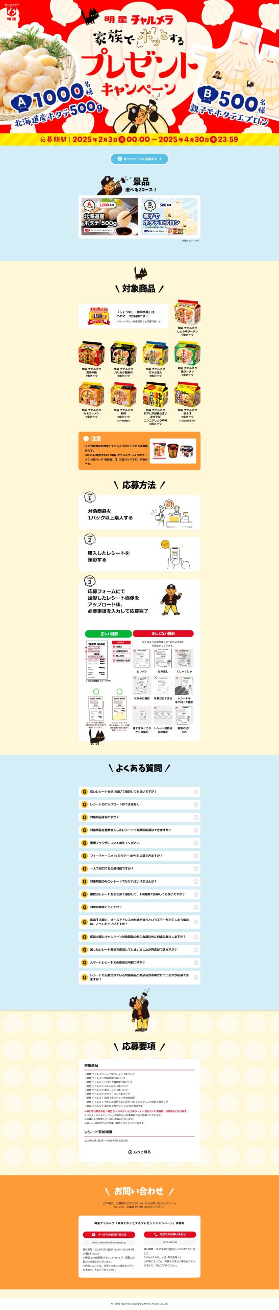 - Aコース:北海道産ホタテ500g+チャチャッとチャルメラレシピ(1,000名様) Bコース:親子でホタテエプロン+明星 チャルメラ 3食セット(しょうゆ/宮崎辛麺/バリカタ麺豚骨)(500名様)