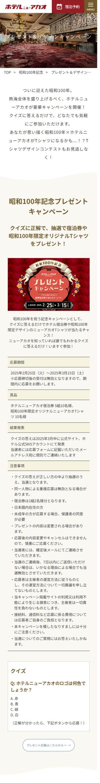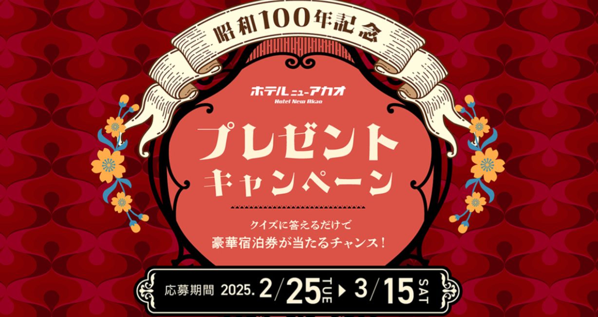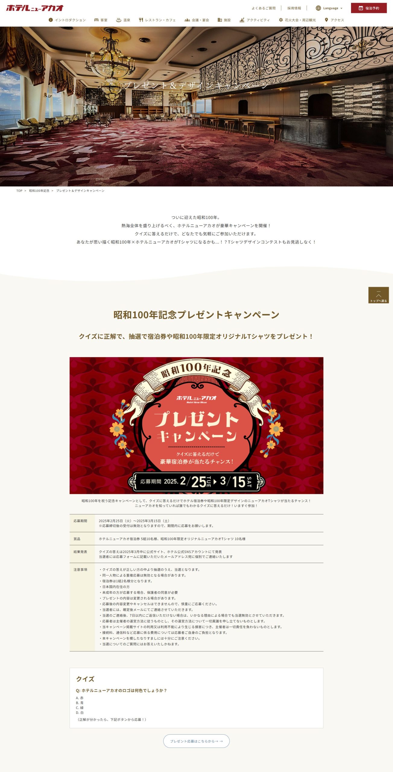 - 昭和100年を祝う記念キャンペーンとして、クイズに答えるだけでホテル宿泊券や昭和100年限定デザインのニューアカオTシャツが当たるチャンス!