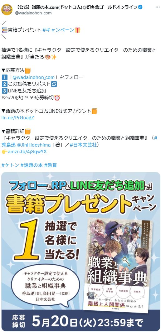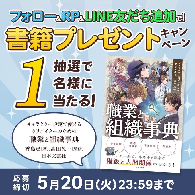 - 書籍『キャラクター設定で使えるクリエイターのための職業と組織事典』 1名様