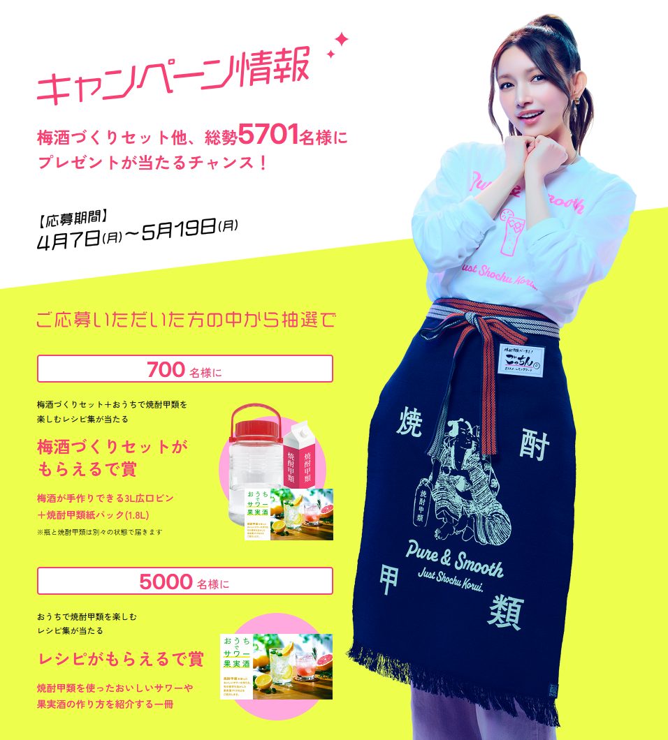 - ・梅酒づくりセットがもらえるで賞 700名様 ・レシピがもらえるで賞 5000名様 ・ゴマキの「推し確」賞 後藤真希さんサイン入りロングTシャツ 1名様