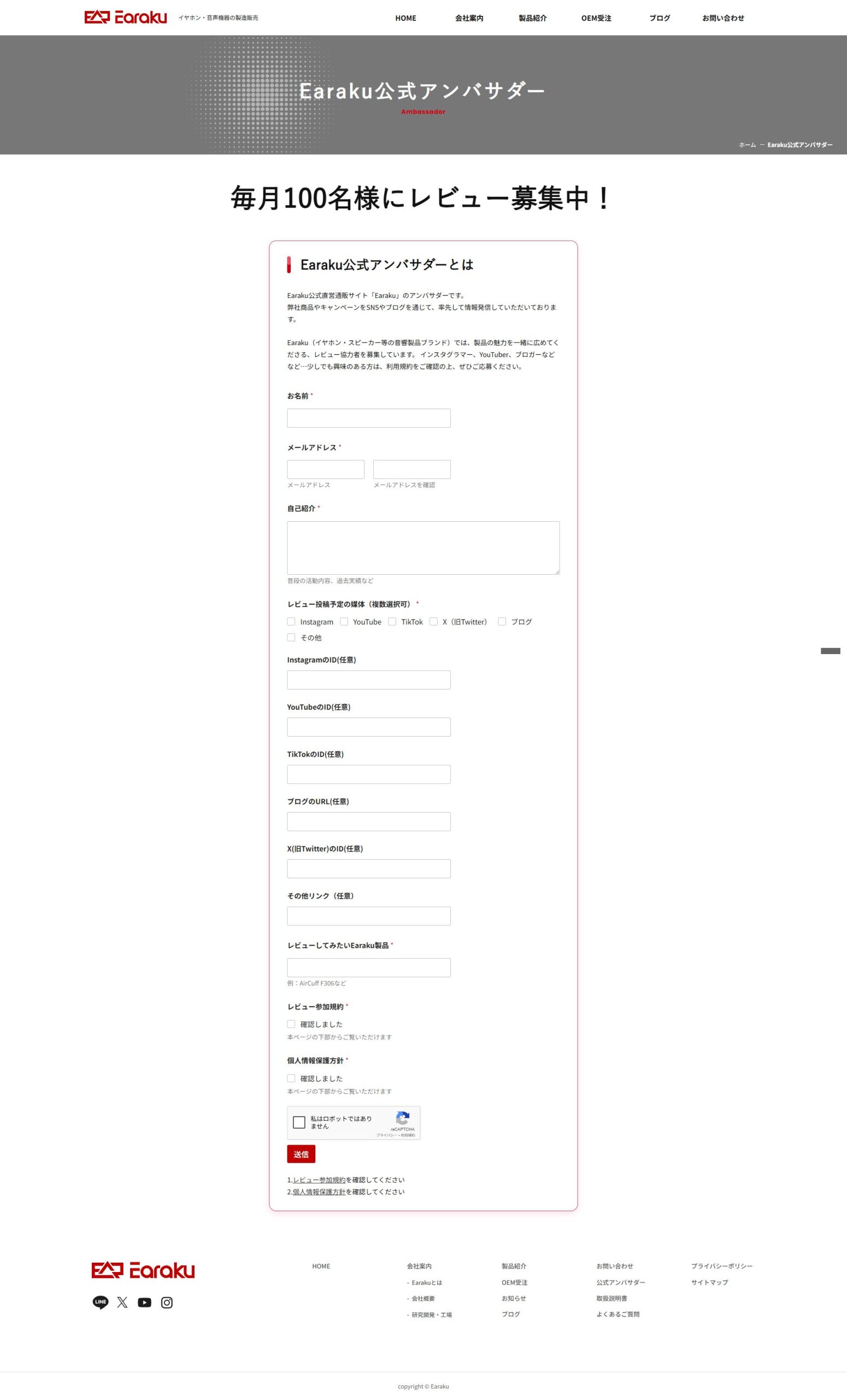 - Earaku(イヤホン・スピーカー等の音響製品ブランド)では、製品の魅力を一緒に広めてくださる、レビュー協力者を募集しています。 インスタグラマー、YouTuber、ブロガーなどなど…少しでも興味のある方は、利用規約をご確認の上、ぜひご応募ください。