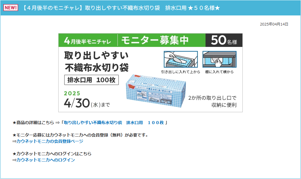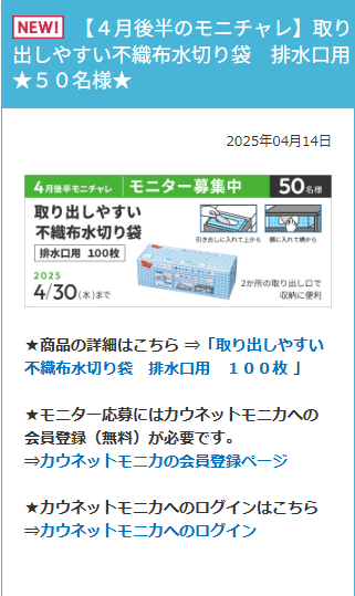モニター応募にはカウネットモニカへの会員登録(無料)が必要です。