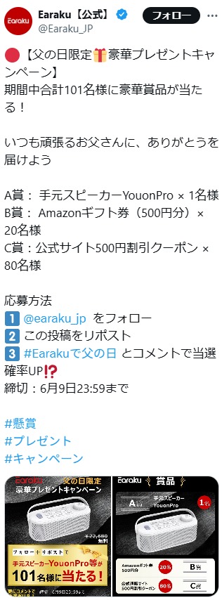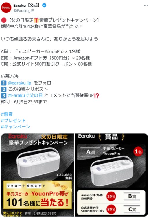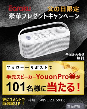 - A賞: 手元スピーカーYouonPro × 1名様 B賞: Amazonギフト券(500円分)× 20名様 C賞:公式サイト500円割引クーポン × 80名様
