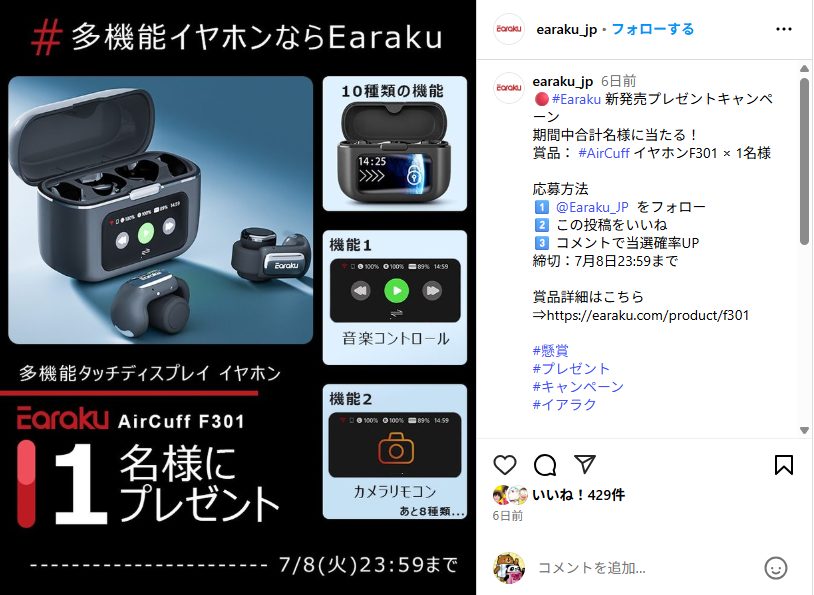 - 🔴#Earaku 新発売プレゼントキャンペーン 期間中合計1名様に当たる! 賞品: #AirCuff イヤホンF301 × 1名様