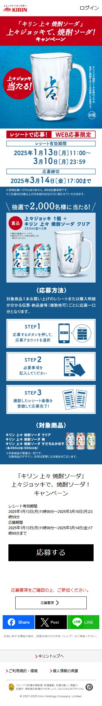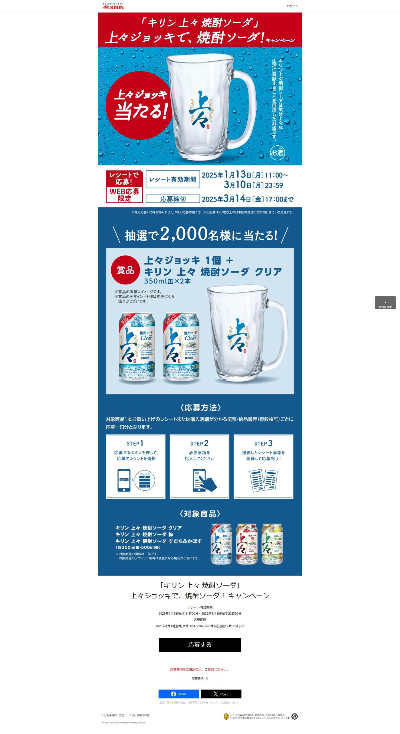 - 上々ジョッキ 1個(サイズ:最大径φ90×H135mm、容量410ml)、キリン 上々 焼酎ソーダ クリア 350ml缶×2本 総計2,000名様