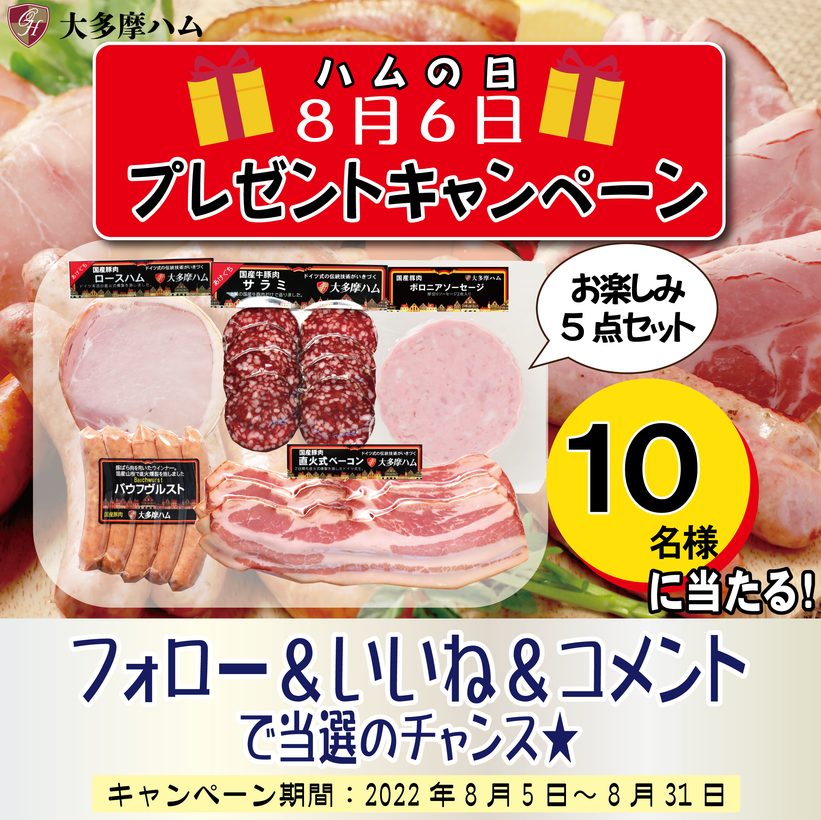 お楽しみ5点セット(ロースハム63g/ベーコン65g/サラミ40g/バウフヴルスト110g/ボロニアソーセージ100g) Twitter 10名様 / Instagram 10名様 (合計 20名様)