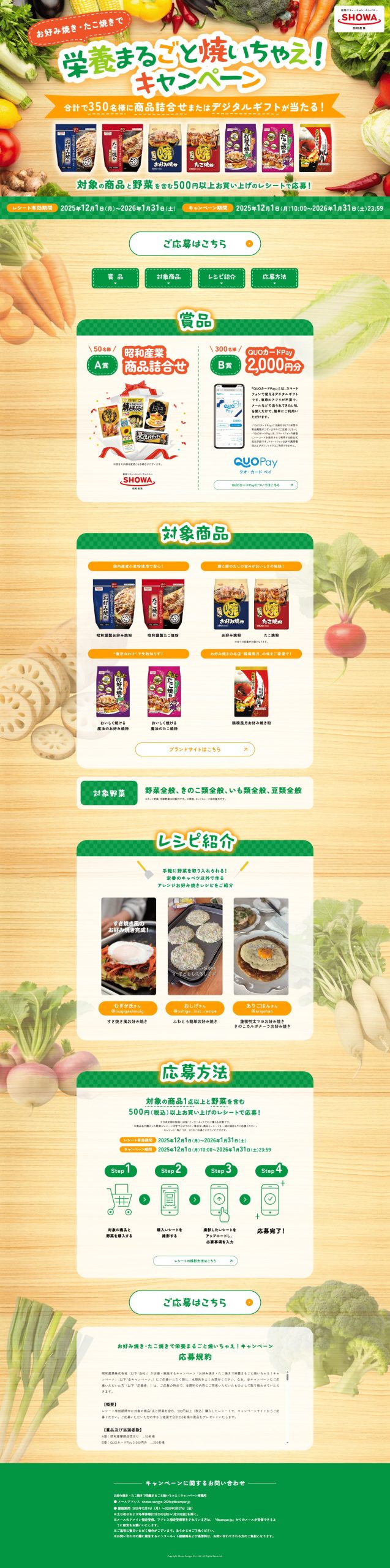 - A賞:昭和産業商品詰合せ …50名様 B賞:QUOカードPay 2,000円分 …300名様