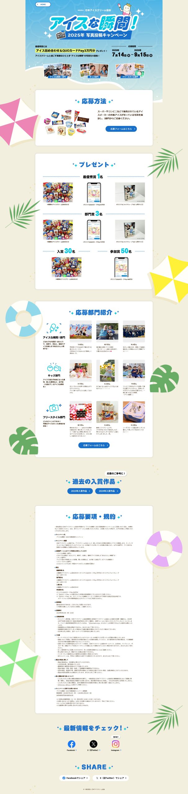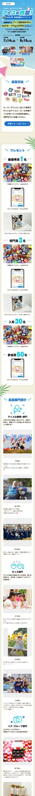 - ・最優秀賞1名:15種類のアイスクリーム詰め合わせ+オリジナルQUOカードPay 3万円分+オリジナルフォトキューブ1点(L判サイズ) ・部門賞3名:15種類のアイスクリーム詰め合わせ+オリジナルQUOカードPay 1万円分+オリジナルフォトキューブ1点(L判サイズ) ・入賞30名:15種類のアイスクリーム詰め合わせ ・参加賞50名:オリジナルQUOカードPay 500円分