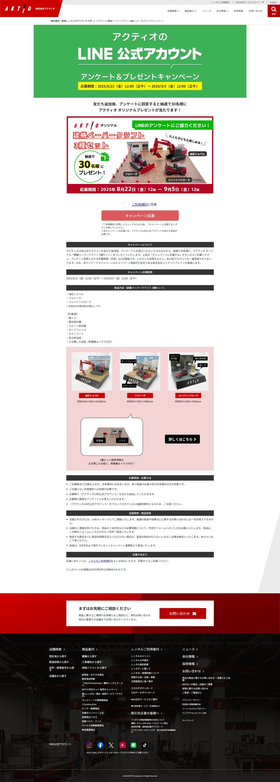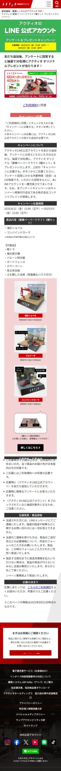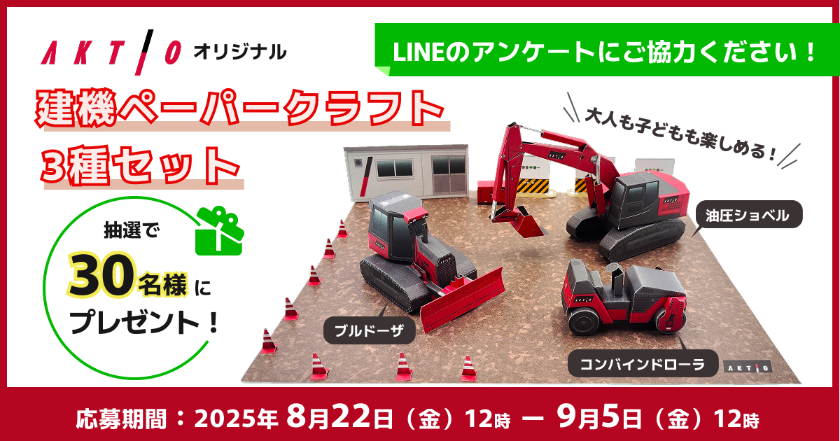 - アクティオLINE公式アカウントを友だち追加後、アンケートにお答えいただいた方のなかから、抽選で30名様に、アクティオ オリジナル「建機ペーパークラフト 3種セット」をプレゼントいたします。上記の「キャンペーンに応募する」ボタンからご応募ください。