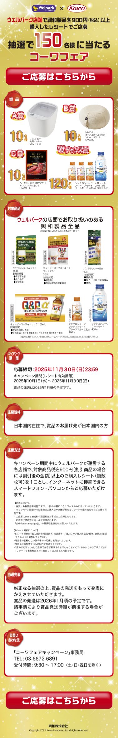 - キャンペーン期間中にウェルパークが運営する各店舗で、対象商品税込900円(割引商品の場合には割引後の金額)以上のご購入レシート(複数枚可)を1口とし、インターネットに接続できるスマートフォン・パソコンからご応募いただけます。