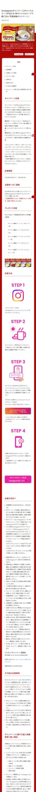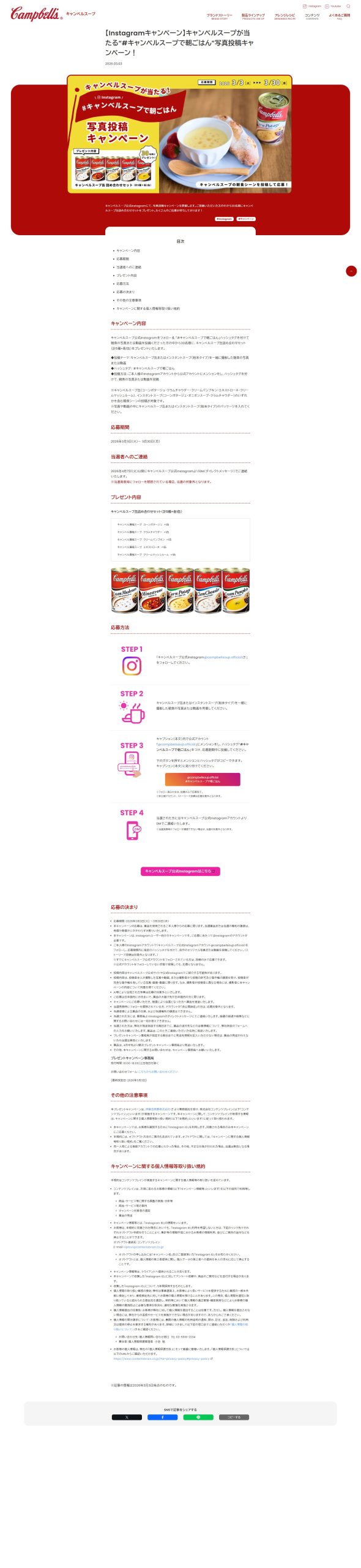 - キャンベルスープ公式Instagramをフォロー& 「#キャンベルスープで朝ごはん」ハッシュタグを付けて朝食の写真または動画を投稿くださった方の中から30名様に、キャンベルスープ缶詰め合わせセット(計5種×各1缶)をプレゼントいたします。