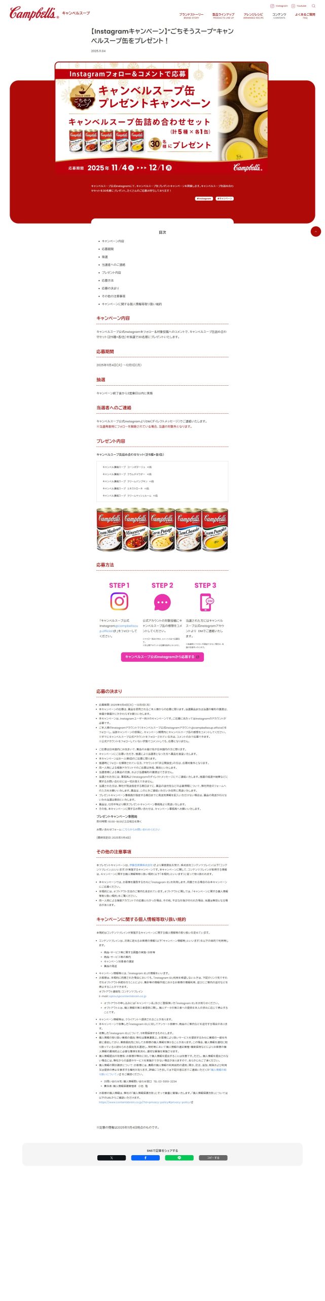 - キャンベルスープ公式Instagramをフォロー&対象投稿へのコメントで、キャンベルスープ缶詰め合わせセット(計5種×各1缶)を抽選で30名様にプレゼントいたします。