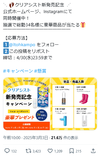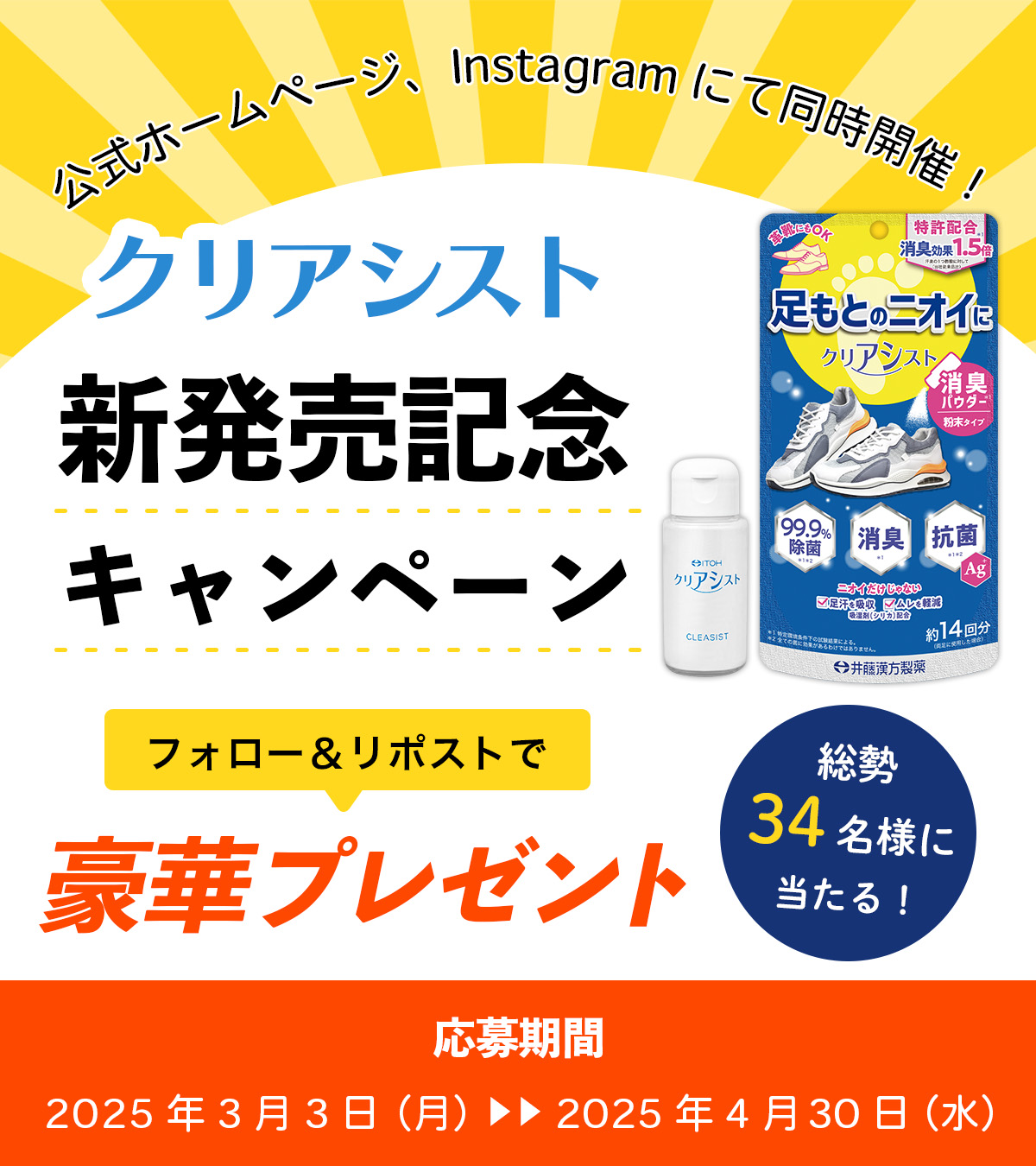 - A賞(1名様)Dyson加湿空気清浄機 B賞(3名様)Panadonic エアマッサージャー C賞(10名様)DoctoAir エクサガンハイパー D賞(20名様)ISIS OHYAMA 脱臭くつ乾燥機 カラリエ
