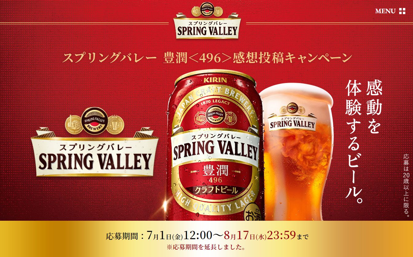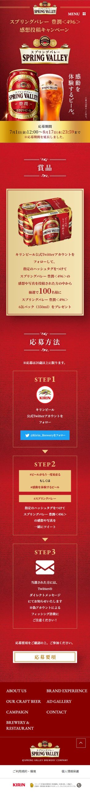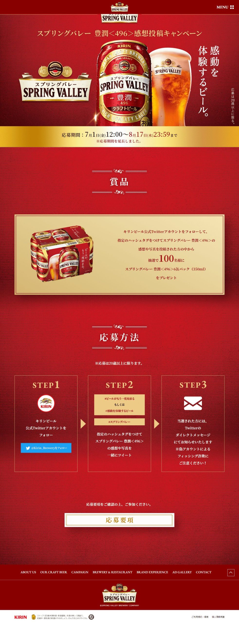 2.期間中「#ビールがもう一度始まる」または「#感動を体験するビール」と、「#スプリングバレー」両方のハッシュタグと、スプリングバレー 豊潤<496>を楽しんでいる写真と感想と共にTwitterで投稿してください。
