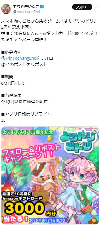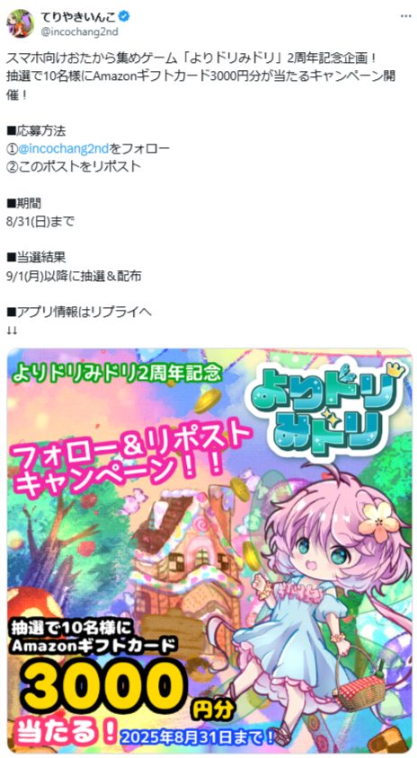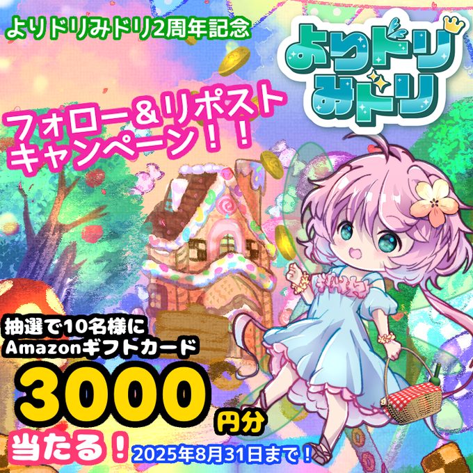 - スマホ向けおたから集めゲーム「よりドリみドリ」2周年記念企画!抽選で10名様にAmazonギフトカード3000円分が当たるキャンペーン開催!