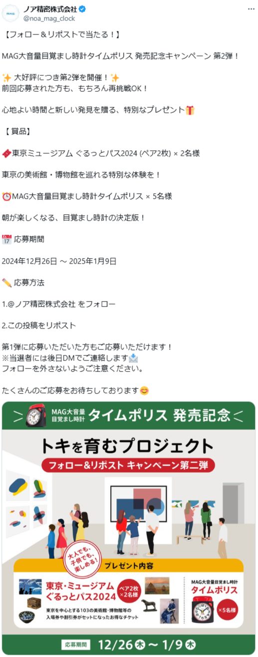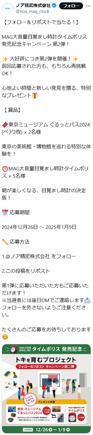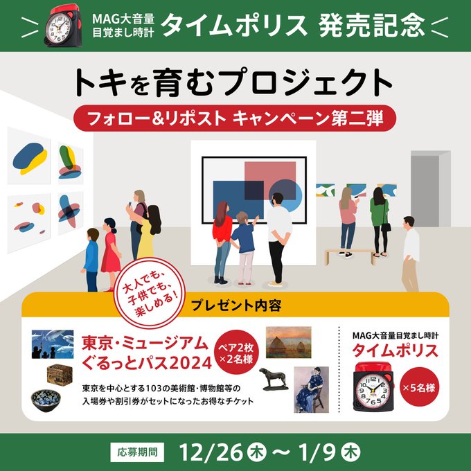- ・東京ミュージアム ぐるっとパス2024 (ペア2枚) × 2名様 ・MAG大音量目覚まし時計タイムポリス × 5名様