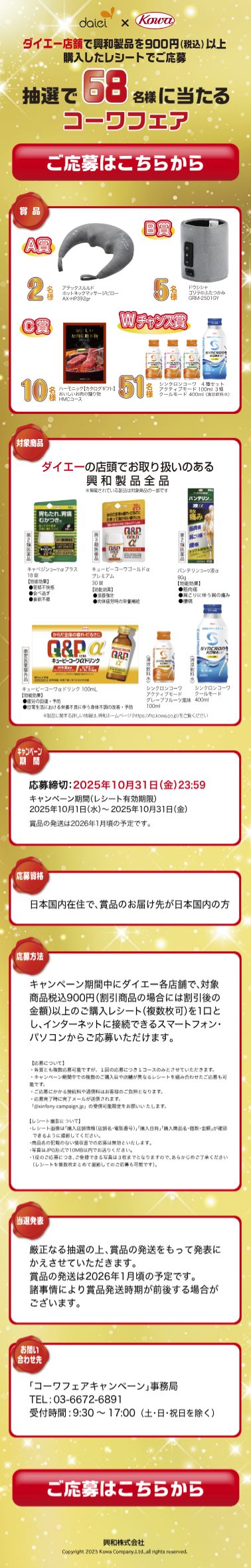 - キャンペーン期間中にダイエー各店舗で、対象商品税込900円(割引商品の場合には割引後の金額)以上のご購入レシート(複数枚可)を1口とし、インターネットに接続できるスマートフォン・ パソコンからご応募いただけます。