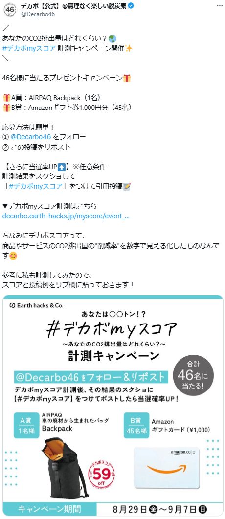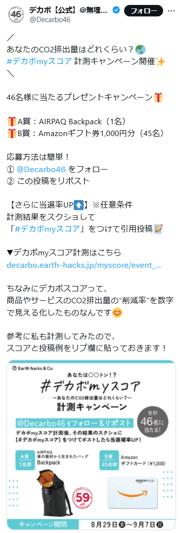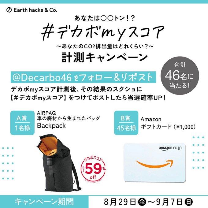 - A賞:AIRPAQ Backpack(1名) B賞:Amazonギフト券1,000円分(45名)