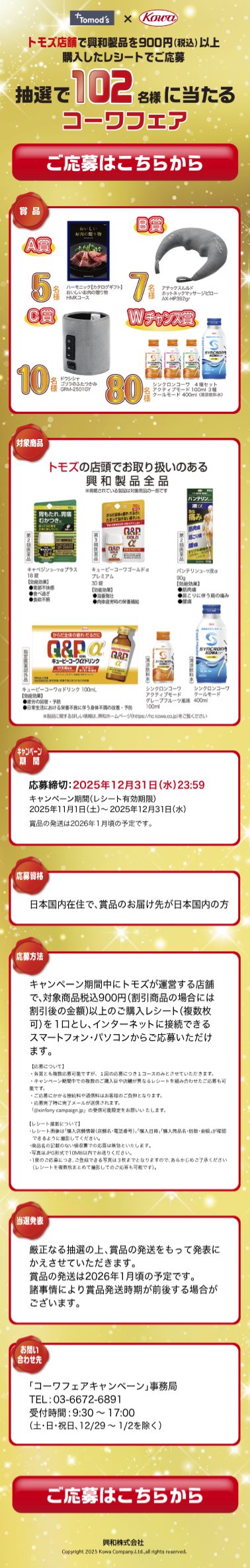 キャンペーン期間中にトモズが運営する店舗で、対象商品税込900円(割引商品の場合には割引後の金額)以上のご購入レシート(複数枚可)を1口とし、インターネットに接続できるスマートフォン・パソコンからご応募いただけます。