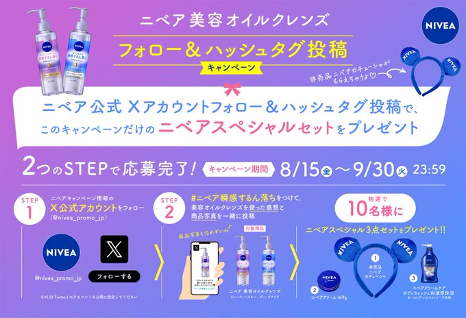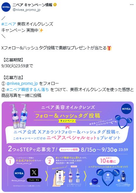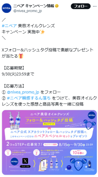➁ #ニベア瞬感するん落ち をつけて、美容オイルクレンズを使った感想と商品写真を一緒に投稿