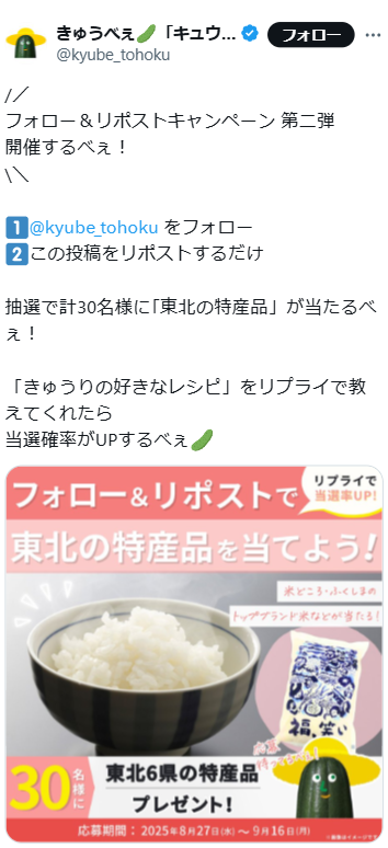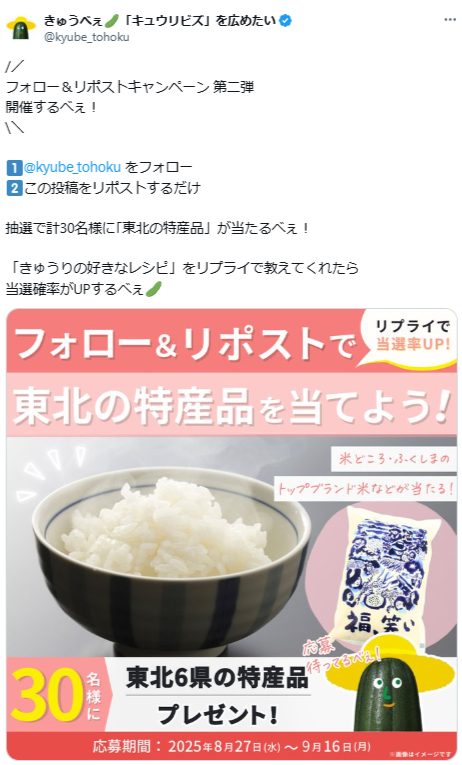 - フォロー&リポストで「お米(5kg)」など、東北の特産品を当てよう!合計30名さまに当たります♪