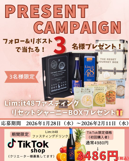 - フォロー&リポストで当たる‼️ プレゼントキャンペーン🎁 リムイット48 ファスティングリセットジャーニーBOX を\抽選で3名様にプレゼント🎁/