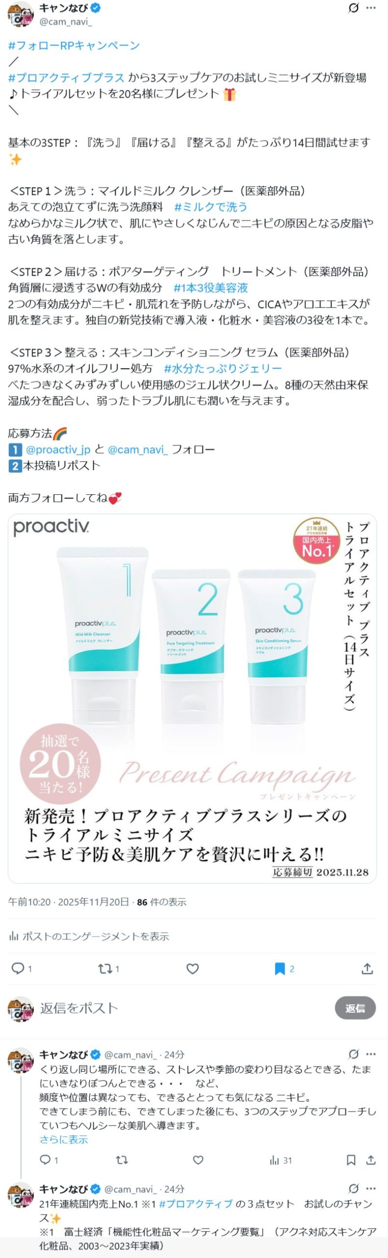 1⃣ @proactiv_jp と @cam_navi_ フォロー