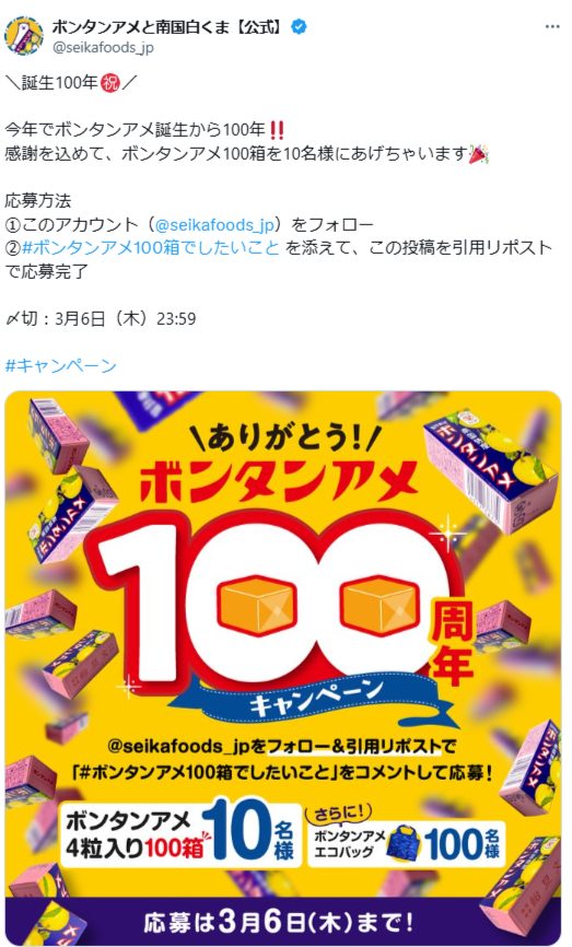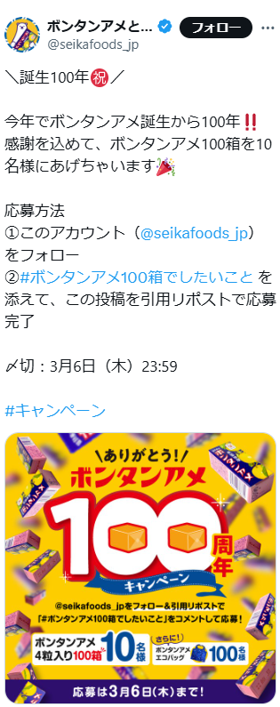 ②#ボンタンアメ100箱でしたいこと を添えて、この投稿を引用リポストで応募完了