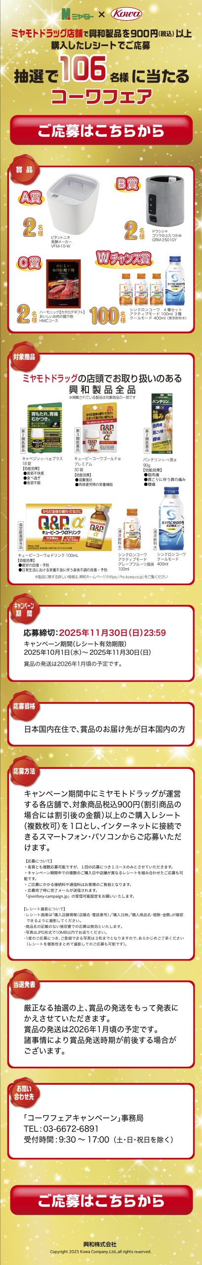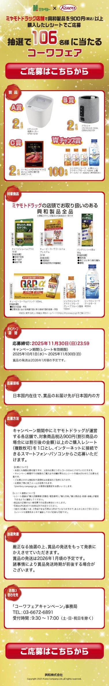 A賞:ビタントニオ発酵メーカー VFM-10-W 2名様  B賞:ドウシシャゴリラのふたつかみ GRM-2501GY 2名様  C賞:ハーモニック 【カタログギフト】 おいしいお肉の贈り物 HMCコース2名様 Wチャンス賞:シンクロンコーワ 4種セットアクティブモード 100ml 3種クールモード 400ml 〈清涼飲料水〉100名様