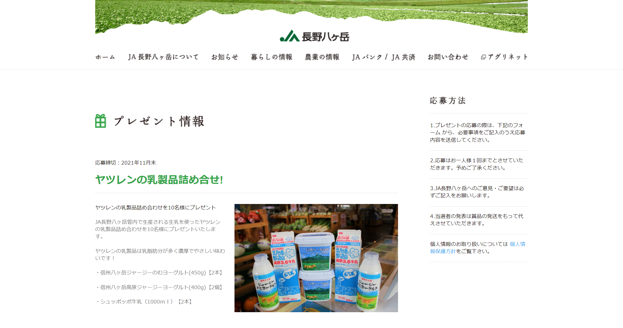 JA長野八ヶ岳管内で生産される生乳を使ったヤツレンの乳製品詰め合わせを10名様にプレゼントいたします。