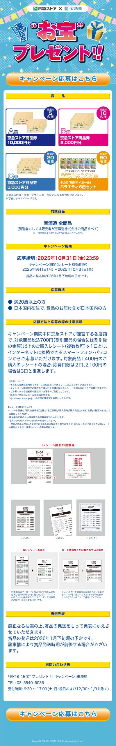 A賞:京急ストア商品券10,000円分5名様  B賞:京急ストア商品券5,000円分10名様  C賞:京急ストア商品券3,000円分20名様  Wチャンス賞:タカラ「焼酎ハイボール」バラエティ6缶セット50名様