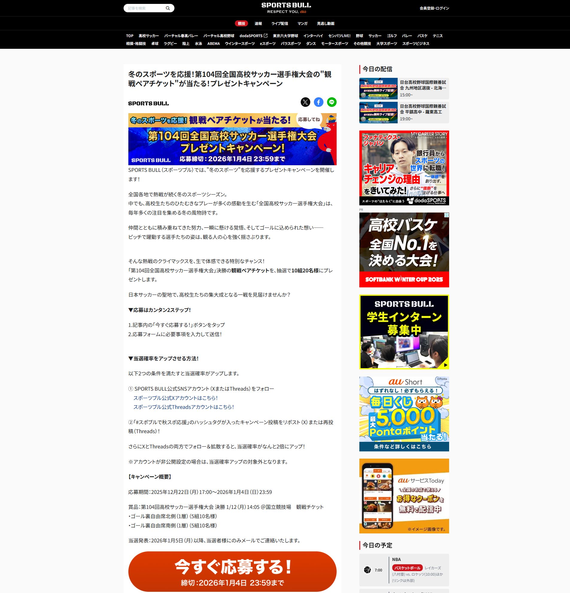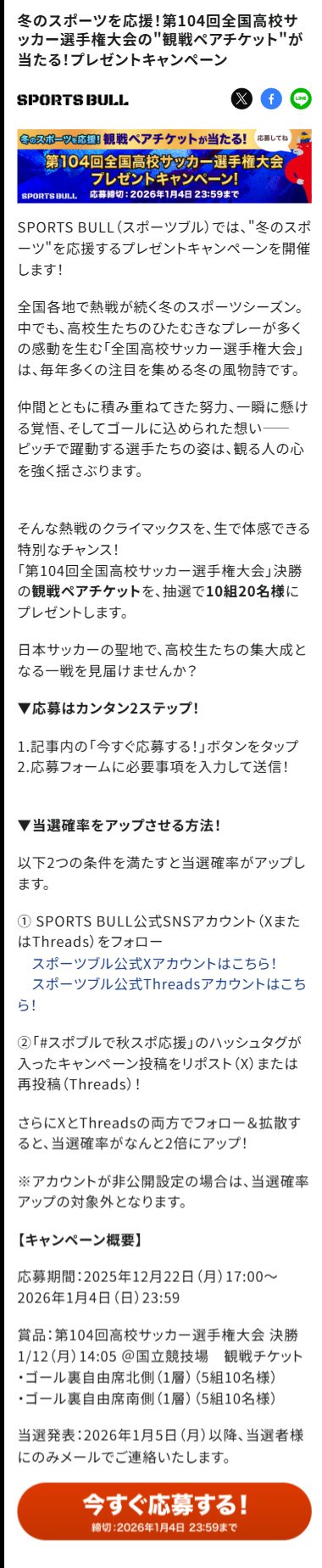 - 冬のスポーツを応援!第104回全国高校サッカー選手権大会の”観戦ペアチケット”が当たる!プレゼントキャンペーン