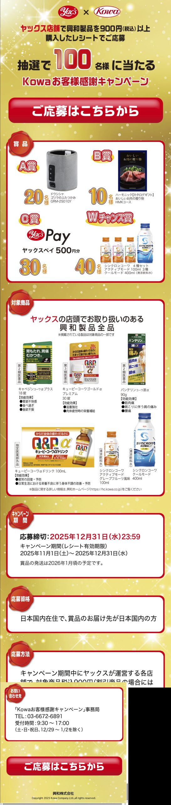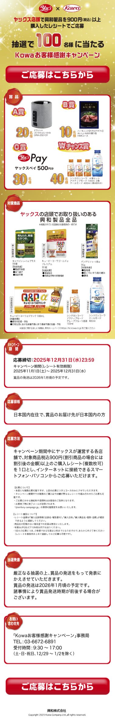 - キャンペーン期間中にヤックスが運営する各店舗で、対象商品税込900円(割引商品の場合には割引後の金額)以上のご購入レシート(複数枚可) を1口とし、インターネットに接続できるスマートフォン・パソコンからご応募いただけます。