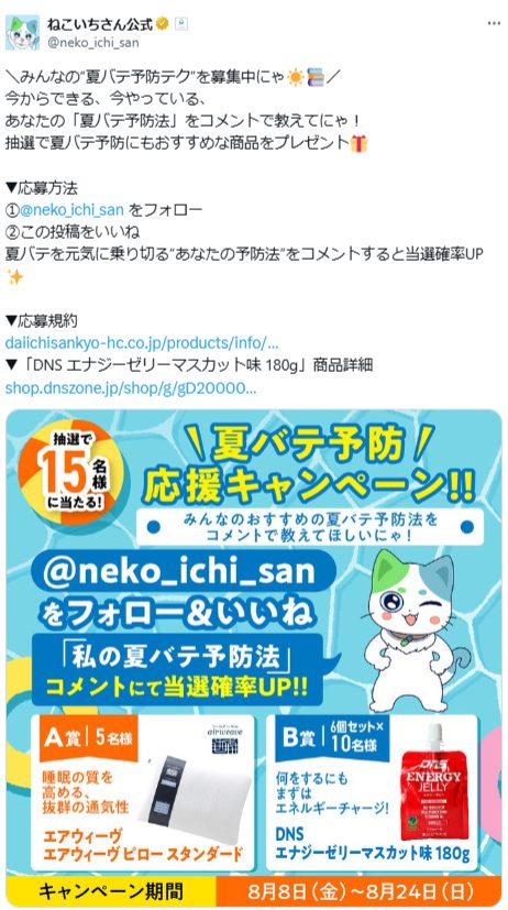 (3)上記に加えて「私の夏バテ予防法」をキャンペーン対象ポスト(ツイート)に返信または、引用ポストでコメントをすることで当選確率がアップします。