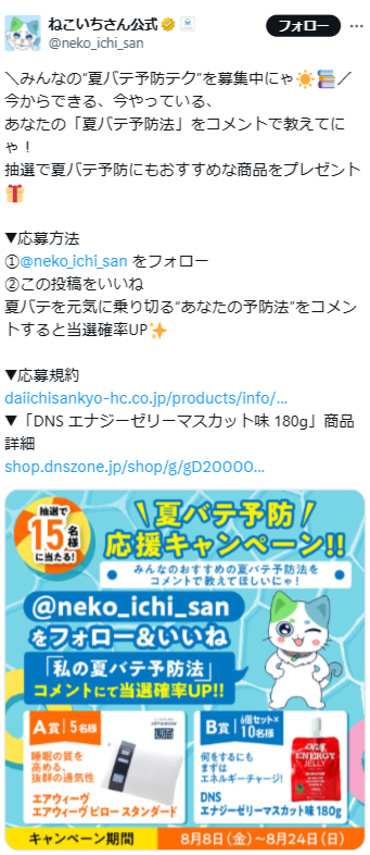 (1)「ねこいちさん」公式X(旧Twitter)アカウント(@neko_ichi_san新しいウィンドウで開く)(以下「公式アカウント」といいます)をフォローしてください。
