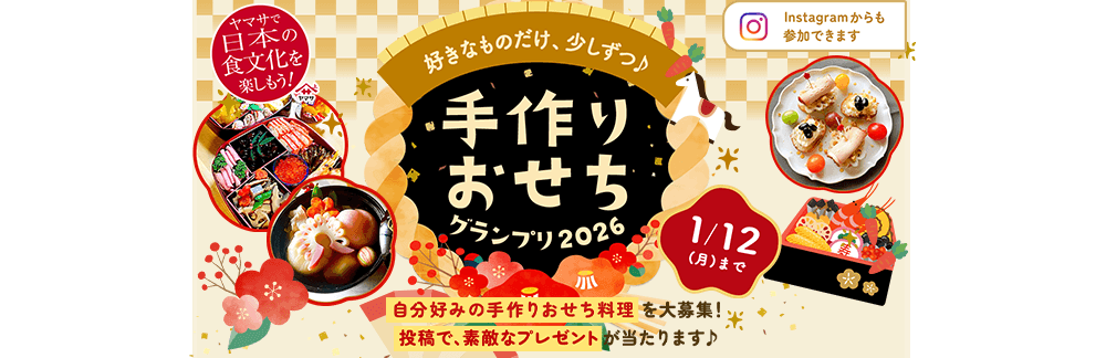 Instagram上で、「@yamasa_soy_sauce」をフォローして ハッシュタグ #ヤマサosechi2026 を付けて投稿してください。