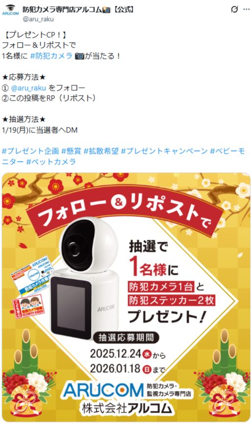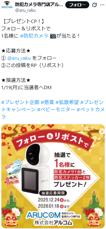 - 抽選で1名様に防犯カメラとステッカーがあたるキャンペーン