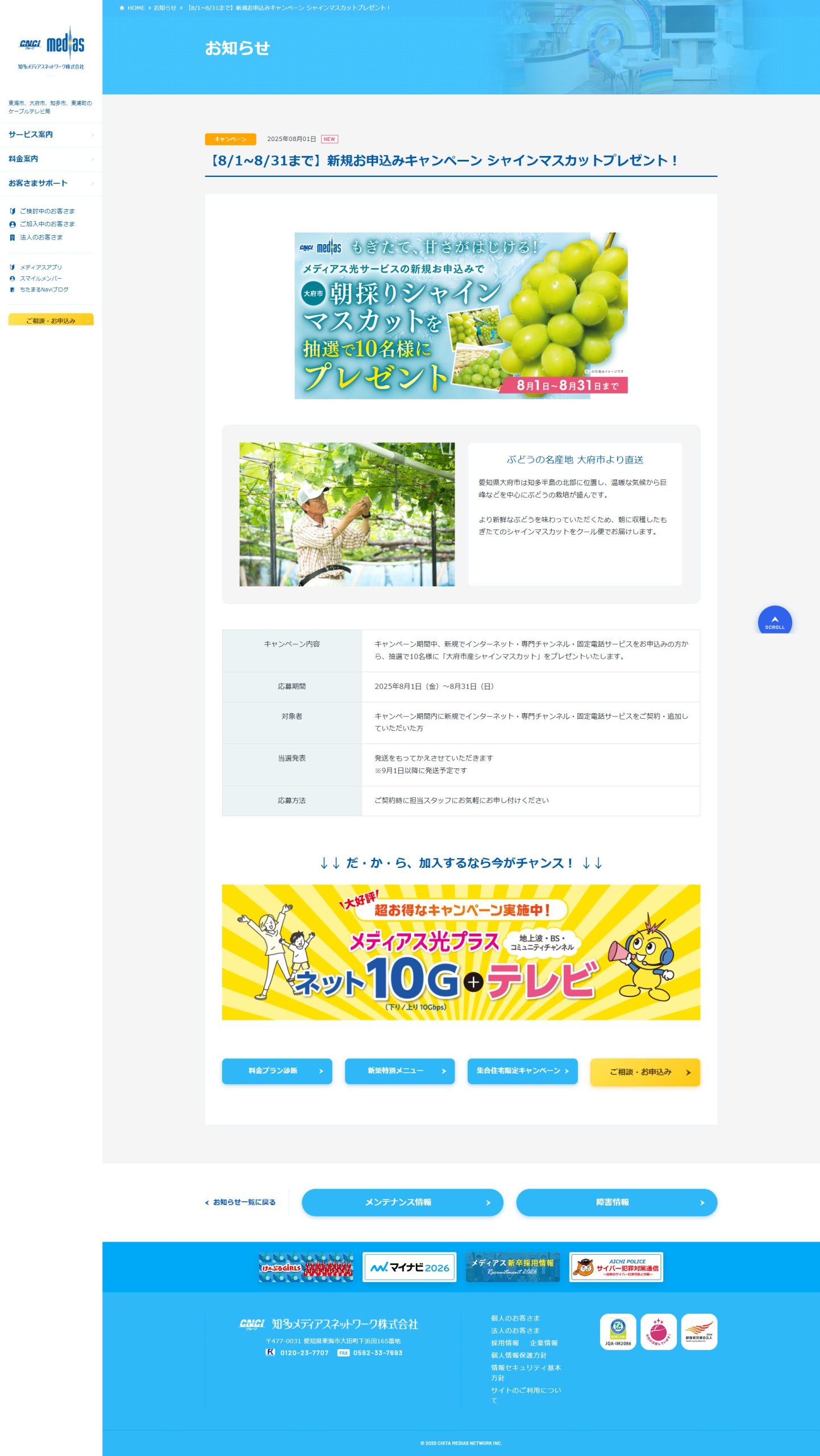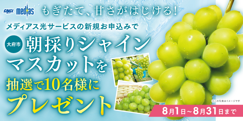 - キャンペーン期間中、新規でインターネット・専門チャンネル・固定電話サービスをお申込みの方から、抽選で10名様に「大府市産シャインマスカット」をプレゼントいたします。