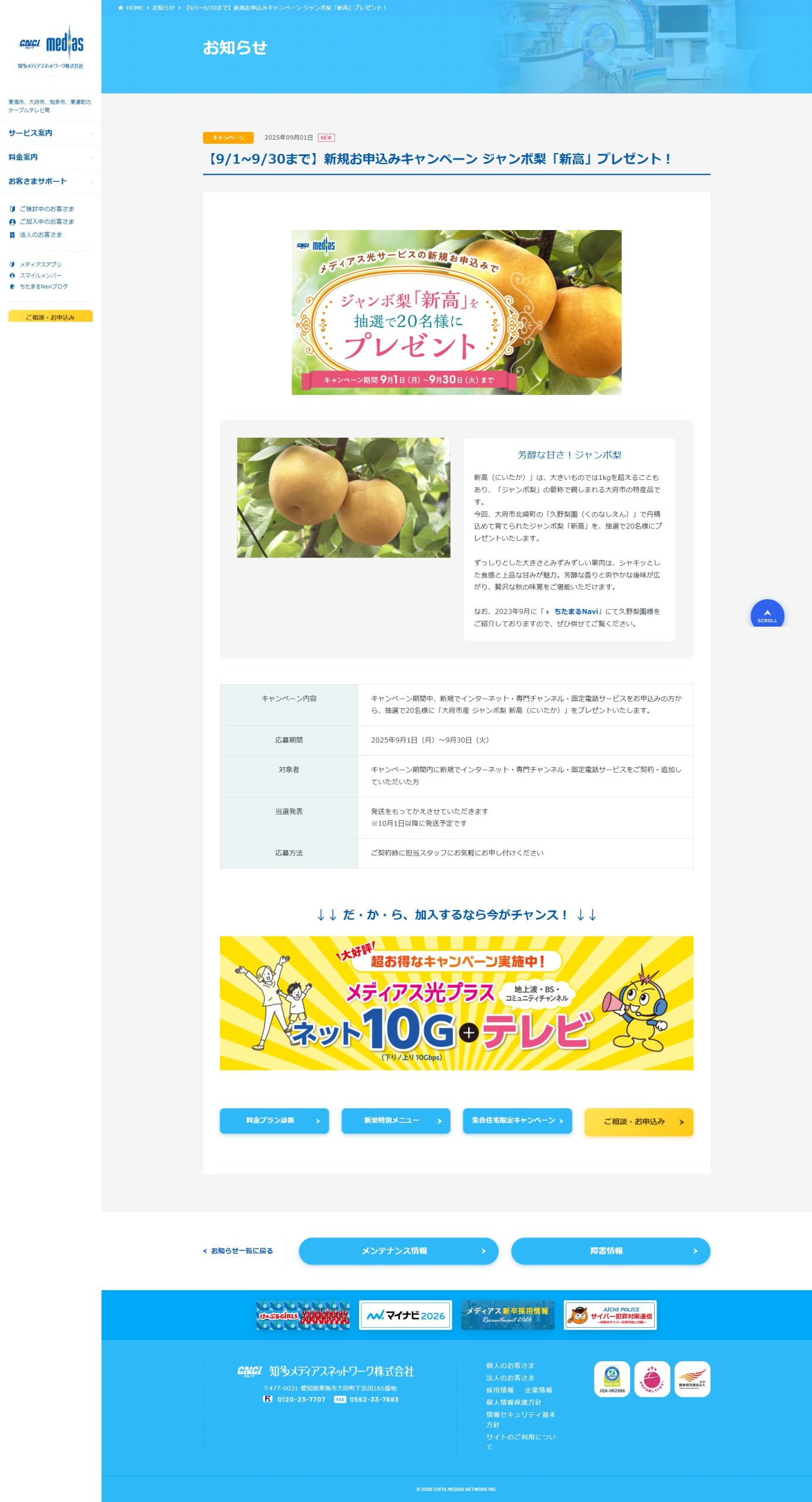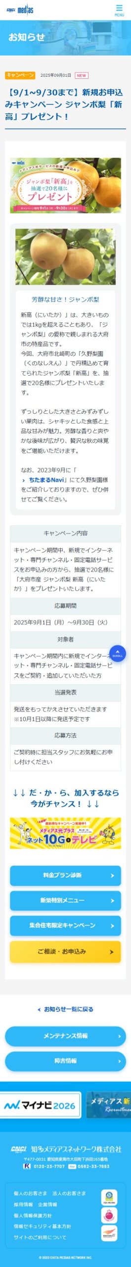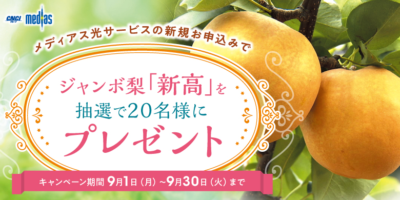 - キャンペーン期間中、新規でインターネット・専門チャンネル・固定電話サービスをお申込みの方から、抽選で20名様に「大府市産 ジャンボ梨 新高(にいたか)」をプレゼントいたします。
