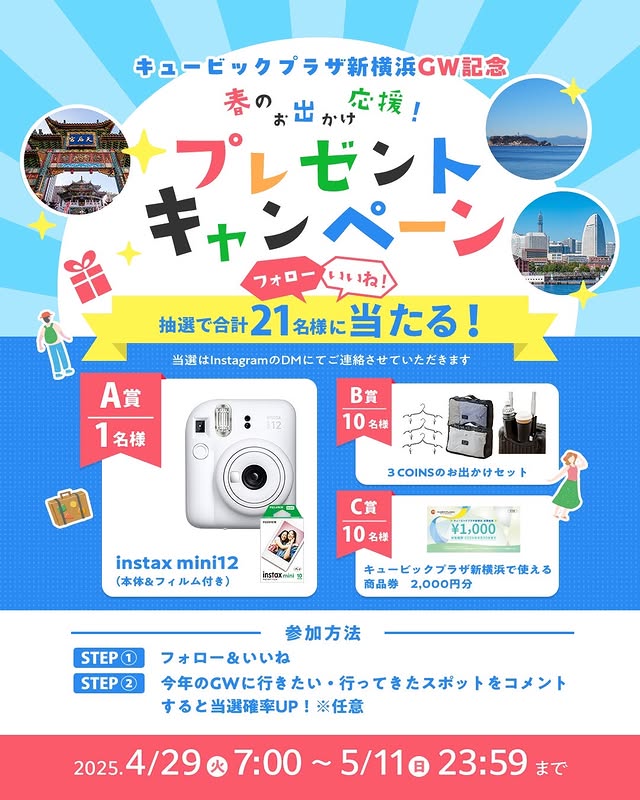 - A賞 チェキ” instax mini 12™ クレイホワイト&チェキ™専用フィルム10枚入り×1名様 B賞 2,100円分相当の旅行グッズ×10名様 C賞 2,000円分商品券×10名様