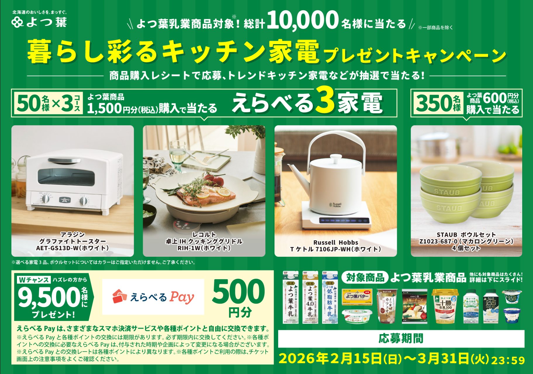 - ⑴600円応募コース:STAUB ボウルセット マカロングリーン Z1023-687-0 350名様 ⑵1,500円応募コース: 選べる3家電 各50名様(計150名様) ⑶Wチャンス:えらべるPay 500円分