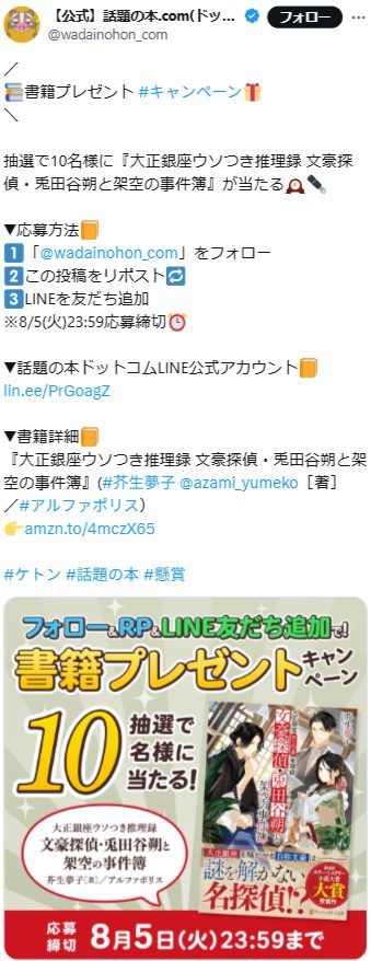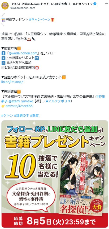 - 書籍『大正銀座ウソつき推理録 文豪探偵・兎田谷朔と架空の事件簿』10名様